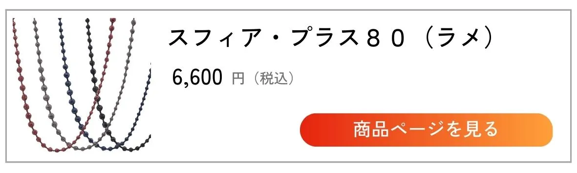 様々な素材があるスフィア・プラスネックレスの中で、秘かに人気があるラメ。冬のシックなスタイルにさりげない輝きが映えるアイテムです。