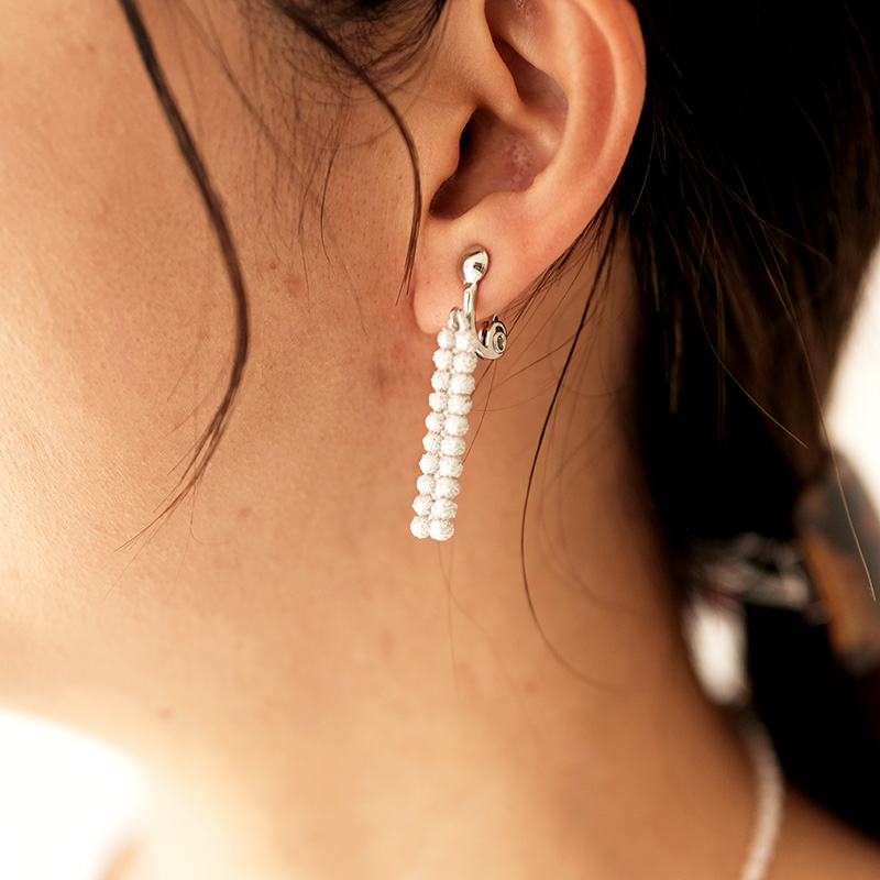 マットなシルバーが似合うサマータイプには、ドロップピアス/イヤリングもおすすめ。小粒のラメ糸が光を乱反射することで、ギラギラしすぎない柔らかな印象のシルバーになります。華美な装飾の無いスッキリとしたデザインで、サマータイプさんの清楚なイメージを引き立てます。