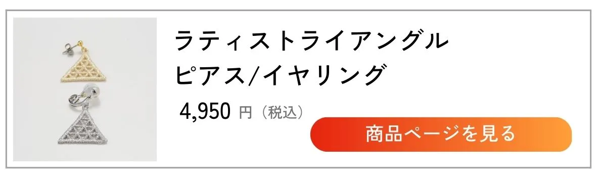 人気のぺブルトリオとラティストライアングルイヤリングの組み合わせは、柔らかく光るラメ糸がポイント。