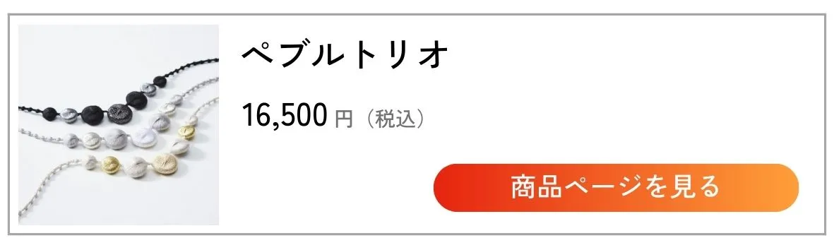 糸玉が真珠のように連なる、シンプルで贈りやすいネックレスです。こちらもカラーバリエーションが豊富なので、普段はつけない色をあえてチョイスするのもプレゼントの醍醐味です。