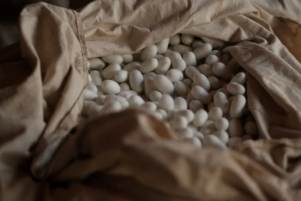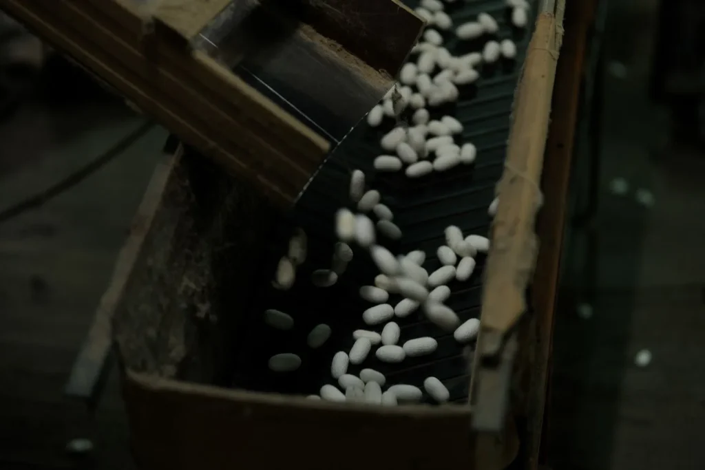 工場の端のほうには、取り出された蚕の蛹が袋詰めにされていました。栄養価が高く、他の生き物の餌として再利用されるとのこと。命は無駄にされません。