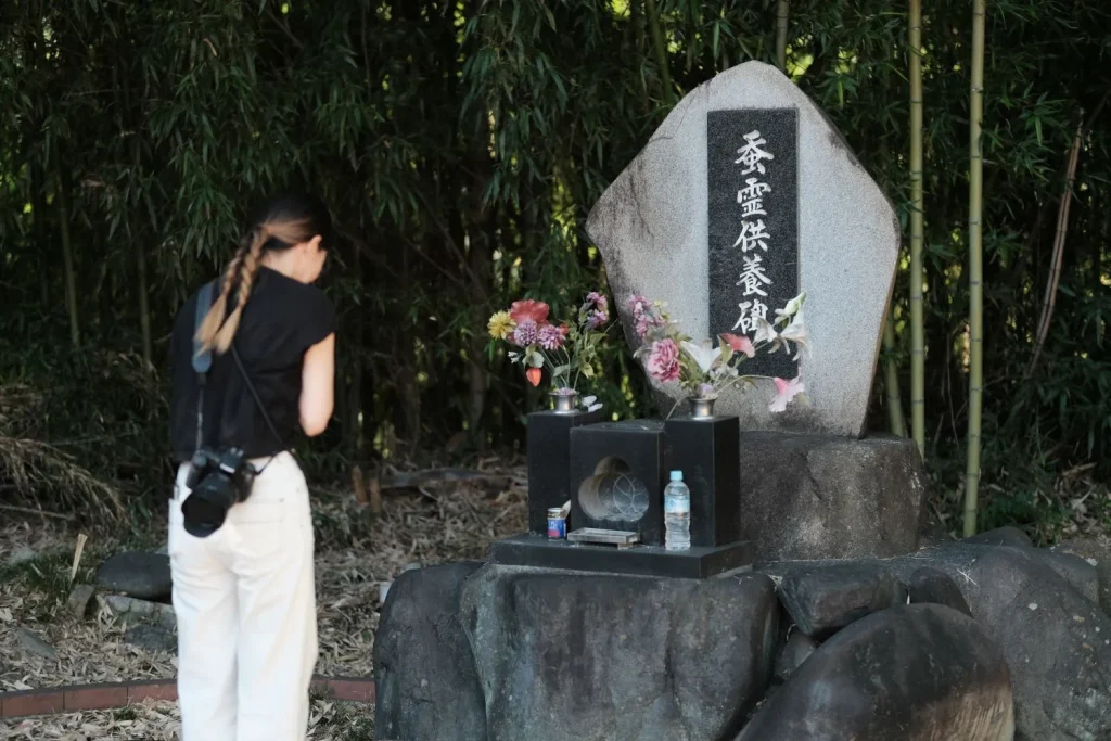 見学の最後に、工場の脇に立つ蚕の供養塔にお参りをしました。