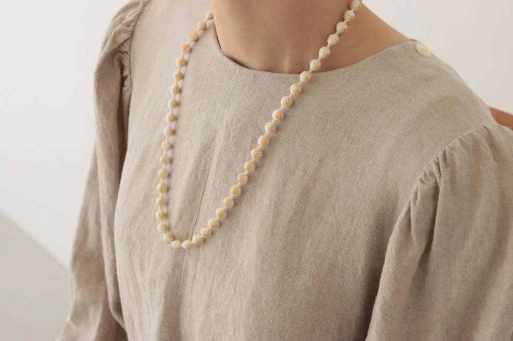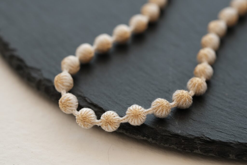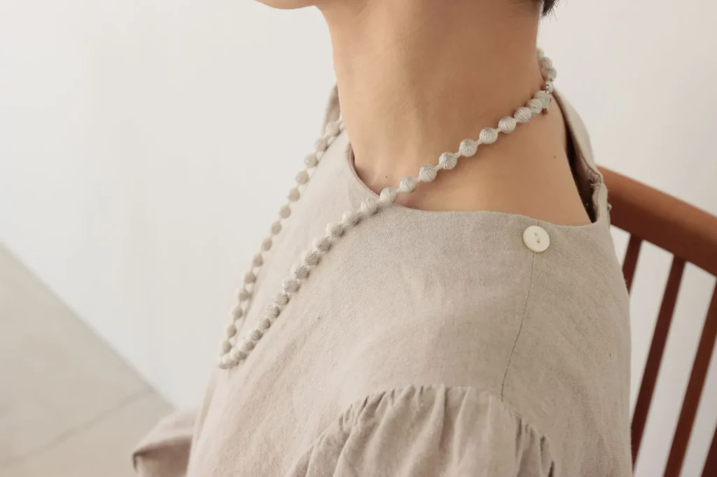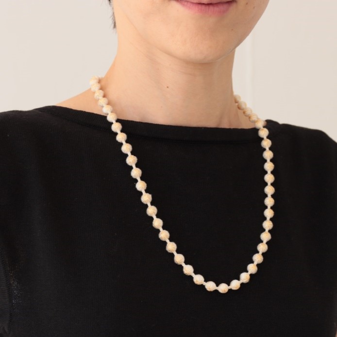 この技法を用いた〈スフィアシルクネックレス KASANE〉は、白いシルクの糸玉にラメ糸を重ねた、まるで雪の結晶のようにきらめくデザイン。