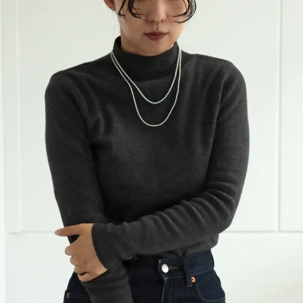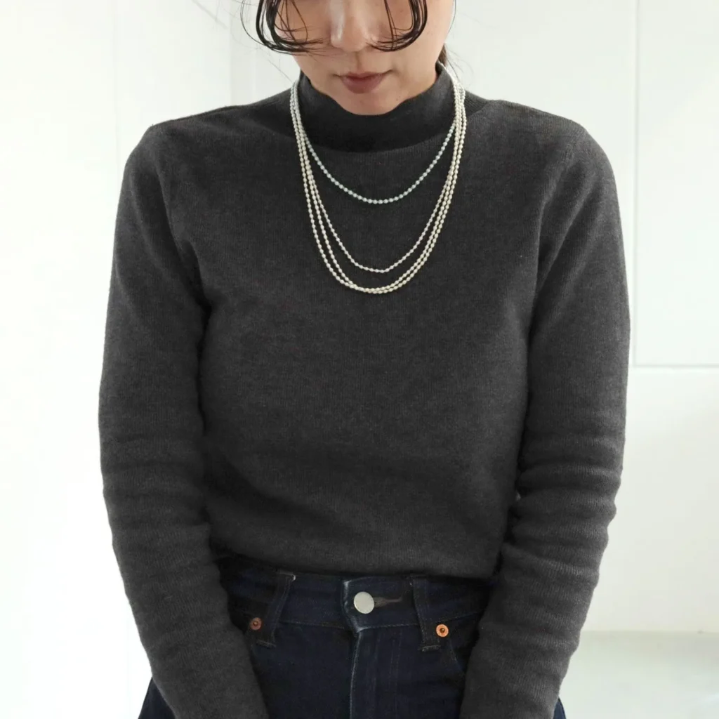 シャツ、ハイネック、Vネックなどどんな襟元にも馴染む万能タイプ。
