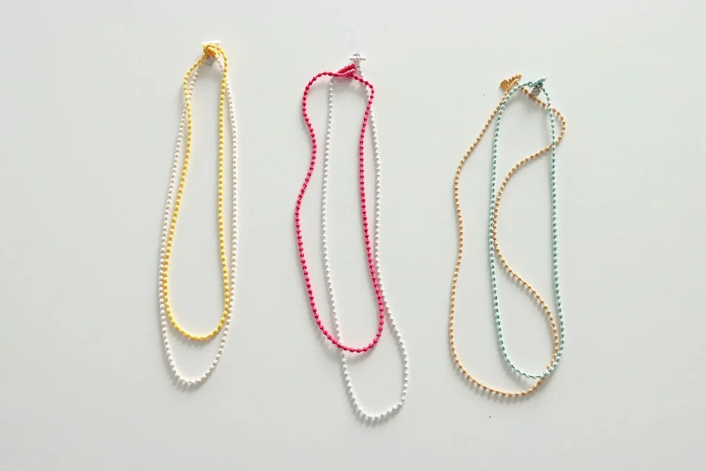 マイクロスフィアネックレスは、重ね着けが映えるデザイン。