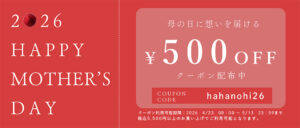 母の日キャンペーンの一環として4/23~5/13の期間、オンラインストアにて¥5500(税込)以上でご利用できる¥500OFFクーポンを発行いたします!
